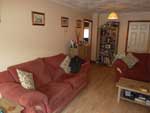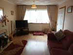 This is a gracious room with a laminated wooden floor, two ceiling lights, large south-facing window and access to the dining room and the kitchen. There's a radiator and a fireplace with an electric fire set into it with tiled insets and a wooden mantelpiece above. The room has a TV aerial point and blinds. |